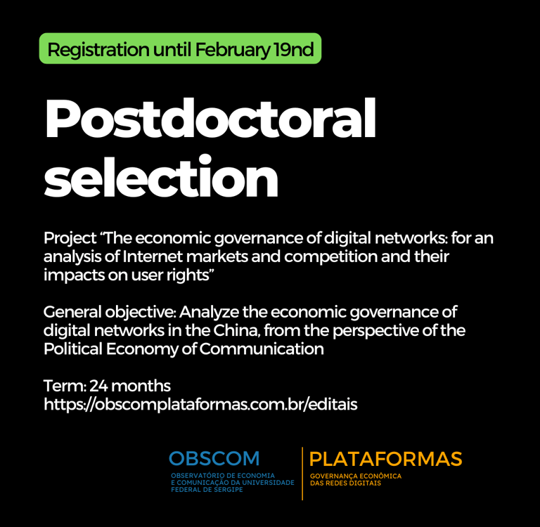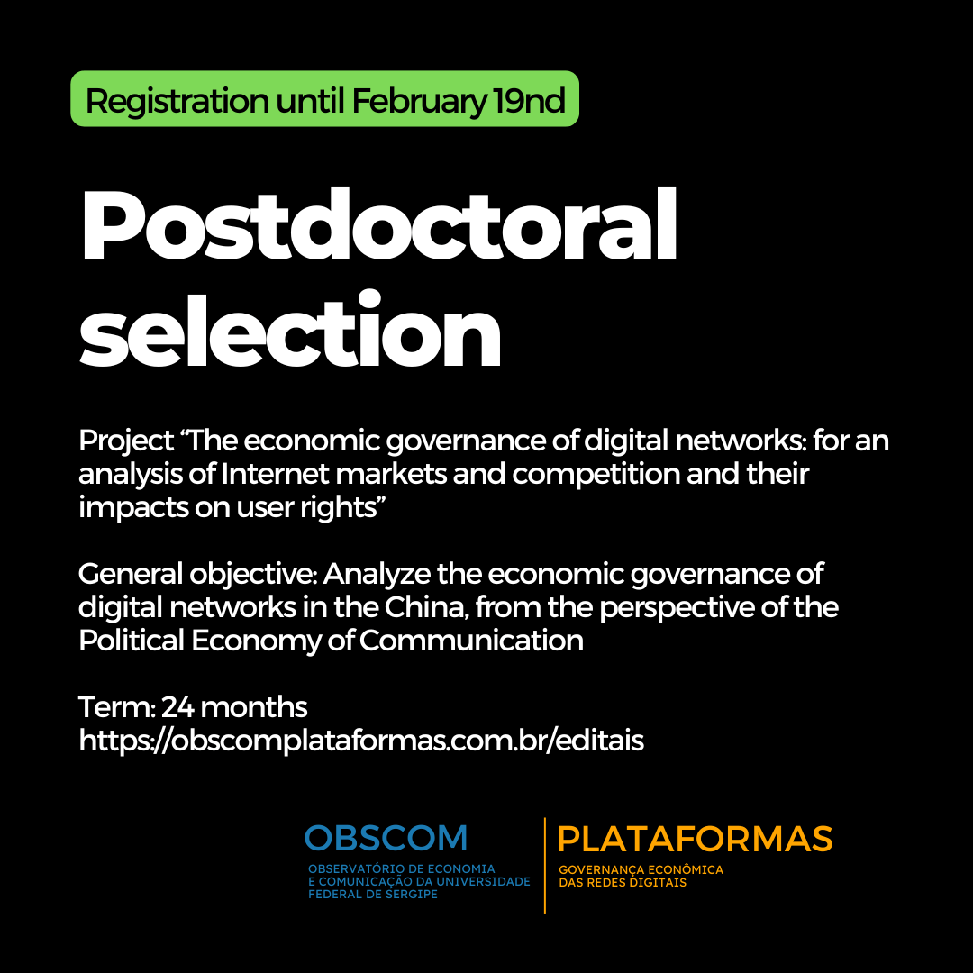 We are a project focused on analyzing the dynamics of economic governance of digital networks and their impacts on the rights of populations in countries on different continents, based on the Political Economy of Communication. We map and evaluate relevant market structures, competitive strategies of the main agents and economic regulation initiatives. An initiative of the Economics and Communication Observatory of the Federal University of Sergipe (OBSCOM-UFS), with funding from FAPESP.
